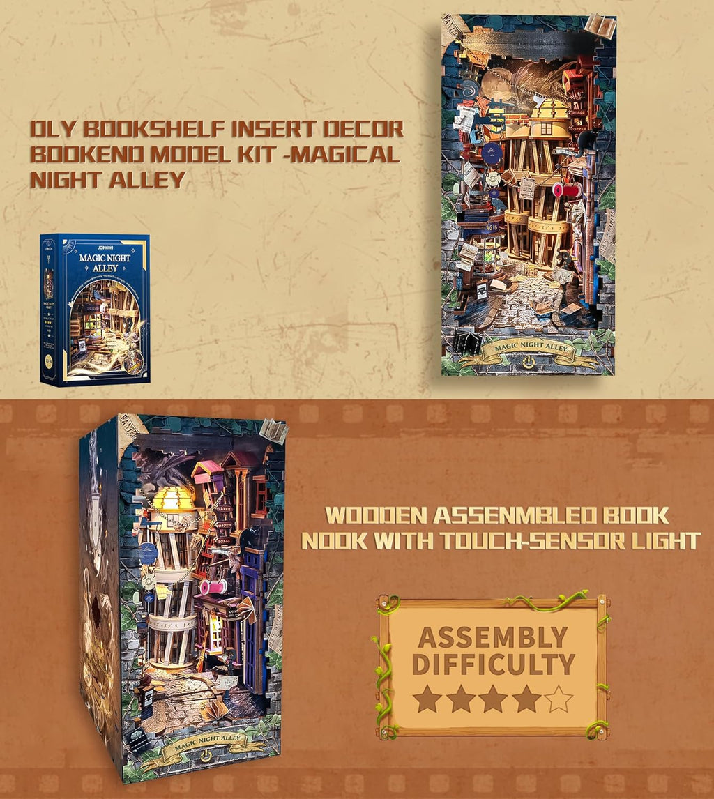Adéntrate en el misterio con el Magic Night Alley Book Nook (SQ16) de Hamaileon. Este diorama de madera te invita a ensamblar una escena nocturna, evocando la atmósfera de un callejón antiguo lleno de historias y secretos, perfectamente enmarcado por la apariencia de libros antiguos.