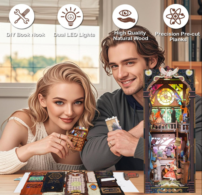 Este kit ofrece un escape mágico de lo cotidiano. El proceso de ensamblaje es una manualidad relajante que mejora tu creatividad mientras reúnes detalles intrincados. Las luces LED incluidas iluminan la escena, creando un ambiente sereno y místico, ideal para desconectar después de un largo día.