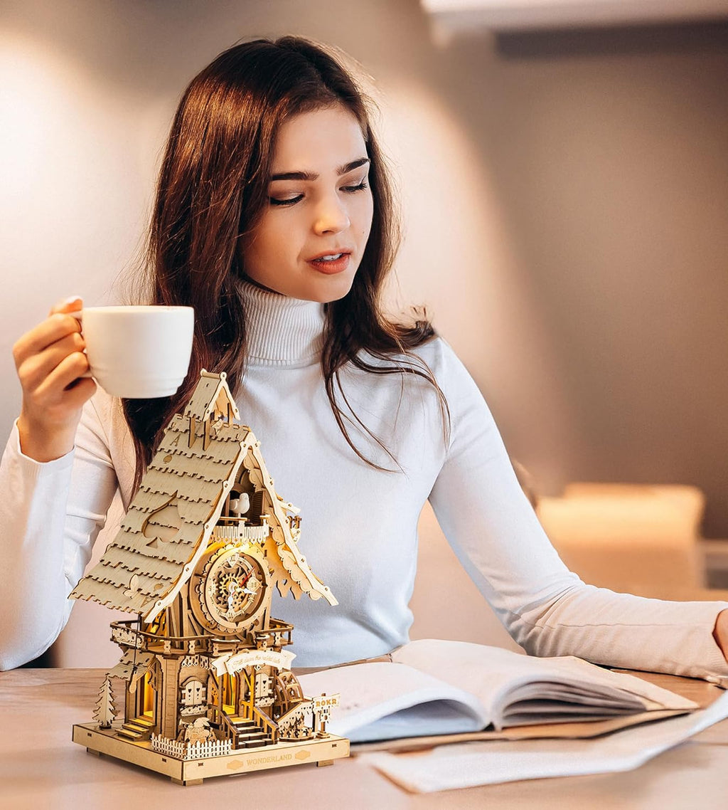 Trae la magia de un bosque encantado a tu hogar. Este kit de modelo 3D ROKR no es solo un rompecabezas, es una pieza de relojería funcional que cobra vida. Al completarlo, tendrás un reloj de escritorio de intrincado diseño que canta "cuco" y marca la hora con una melodía clásica.