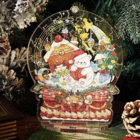 La gran diferencia reside en el material: sus 45 piezas irregulares no son de cartón, sino de acrílico premium. Este material no solo asegura una durabilidad superior, sino que le otorga un acabado nítido y brillante, haciendo que la escena parezca flotar bajo una cúpula de cristal. El oso polar con gorro de Santa, los regalos y el pequeño árbol se convierten en un vívido fragmento de la Navidad.