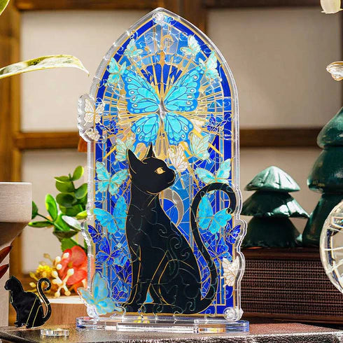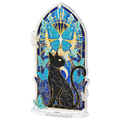 Este diseño es una oda a la elegancia misteriosa. En el centro, un Gato Negro de silueta perfecta se sienta con una mirada enigmática. Detrás de él, el fondo se construye con 60 piezas de acrílico que recrean un vitral azul profundo y místico, del cual emergen mariposas de alas celestes.
